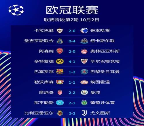 至此,本赛季欧冠联赛阶段第2轮的第2天9场较量战罢,结果分别为:卡拉巴赫2-0哥本哈根、圣吉罗斯联合0-4纽卡斯尔联、阿森纳2-0奥林匹亚科斯、多特蒙德4-1毕尔巴鄂竞技、巴塞罗那1-2巴黎圣日耳曼、勒沃库森1-1PSV埃因霍温、摩纳哥2-2曼城、那不勒斯2-1葡萄牙体育、比利亚雷亚尔2-2尤文图斯。